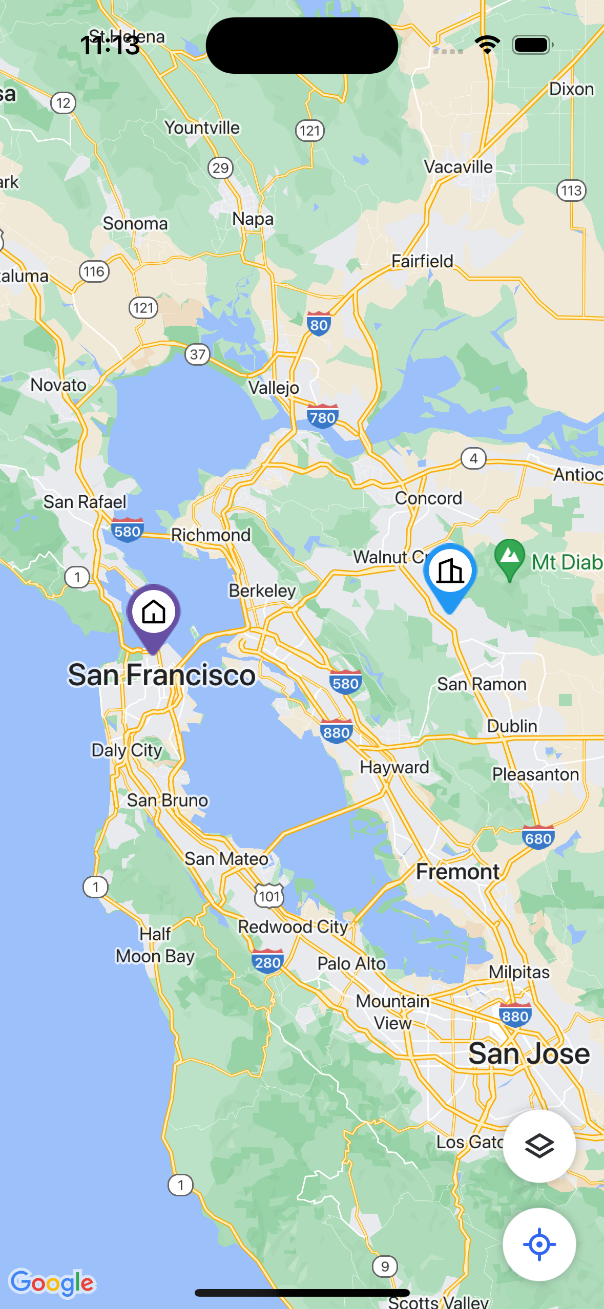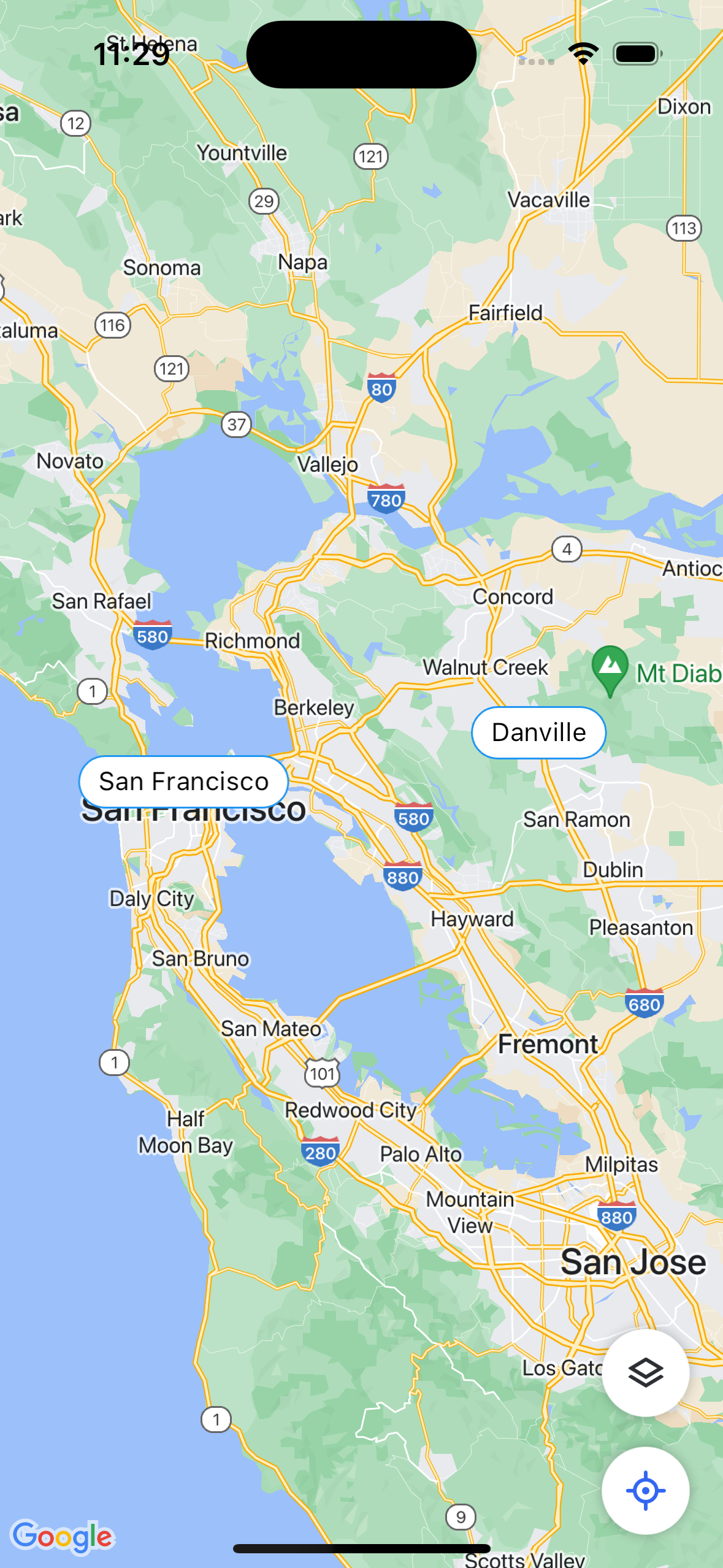 View: onLoad: invokeAPI: name: getVenue body: Map: styles: autoZoom: true autoZoomPadding: 100 markers: data: ${getVenue.body.items} name: item location: ${item.lat} ${item.lng} marker: widget: Text: text: ${item.city} styles: padding: 5 10 borderColor: blue backgroundColor: white borderRadius: 100 textStyle: color: black API: getVenue: uri: https://dummyjson.com/users/1 method: GET onResponse: |- response.body = { "items": [{ "lat": 37.82159, "lng": -121.99996, "city": "Danville" }, { "lat": 37.773972, "lng": -122.431297, "city": "San Francisco" }] };